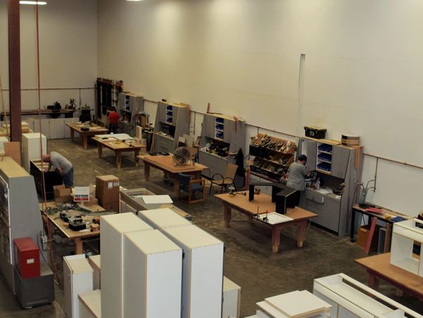 Our 15K square foot factory is equipped with state-of-the-art equipment to cut, finish, and assemble all of the parts and pieces needed for your project, from standard euro cabinets, to complex reception desks. Your project can be made out of the wood or wood product that you specify, painted or stained to your needs, or covered in any laminate that you like. We can provide design support and guidance, or even do the design work from your concept plan or drawing.